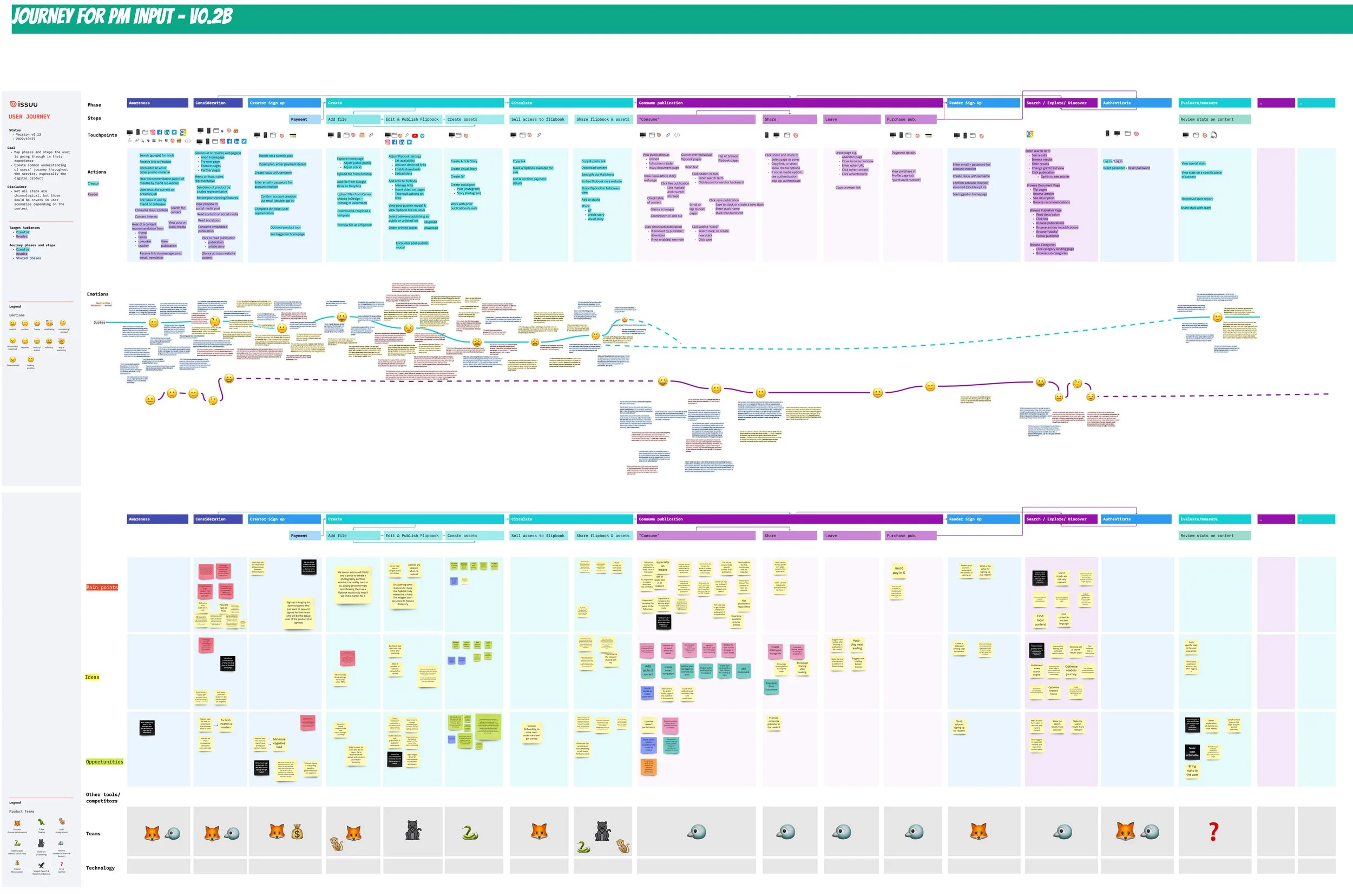I worked with my co-lead (Issuu has two UX leads) and our user researcher to construct a journey map where we pinpointed key moments of both user delight and user discomfort. Numerous quotes were matched to specific pages and other touchpoints within the product. Several major painpoints, as well as many ideas on what to do about them, were plotted onto different sections of the journey map. We also labelled which delivery teams would have ownership over developing any potential changes we may see a need to make.